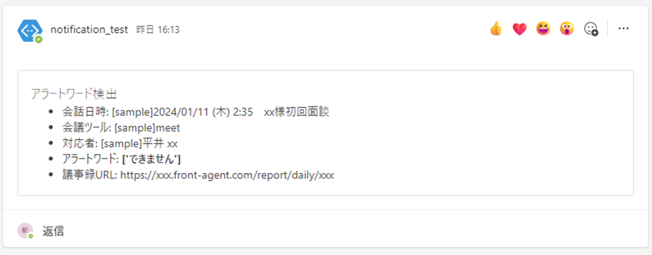 通知の例:担当者が「できません」と発言した時、リアルタイムにMicrosoft Teamsに投稿