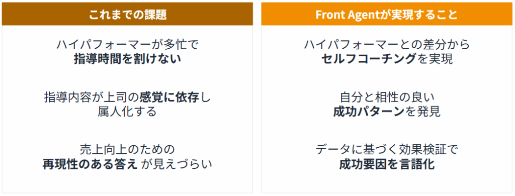 「背中を見て覚えろ」という指導には限界があります。Front Agentは育成を科学し、成長のスピードを加速させます。