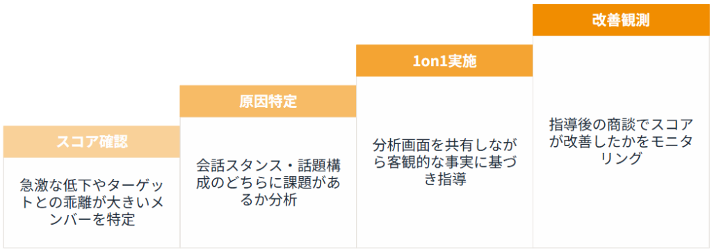アクション: スコアが急激に下がっているメンバーや、ターゲットユーザーとの乖離が大きいメンバーに対し、ピンポイントで指導(またはFront Agentの分析画面を使った1on1)を行います。