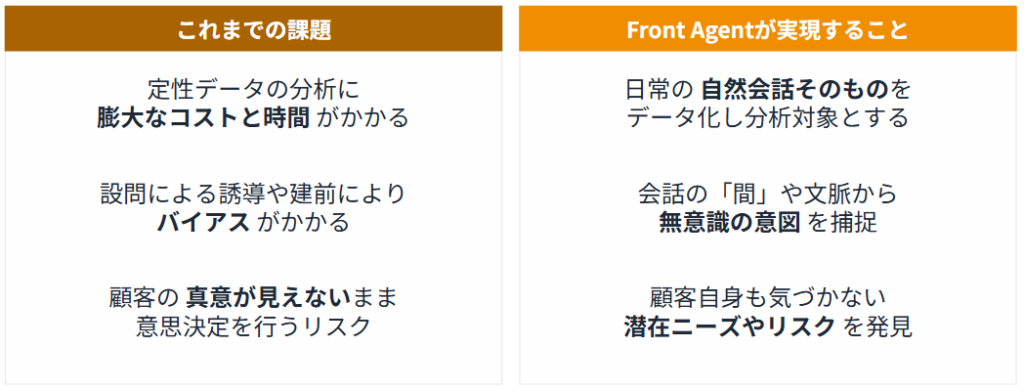 私たちのビジネスにおいて、最も重要な情報は「顧客との会話」の中にあります。しかし、これまではその多くがブラックボックスでした。Front Agentは、「これまで見たかったけれど見えなかったもの」を可視化(見える化)します。