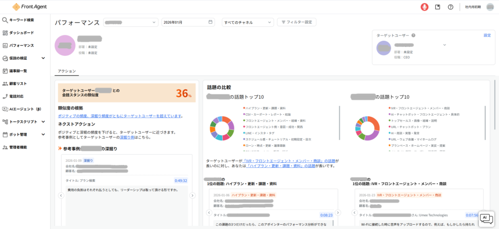 Front Agentでは、録音した会話をもとにメンバー個人のパフォーマンスを可視化する「パフォーマンス画面」 が利用できます。
