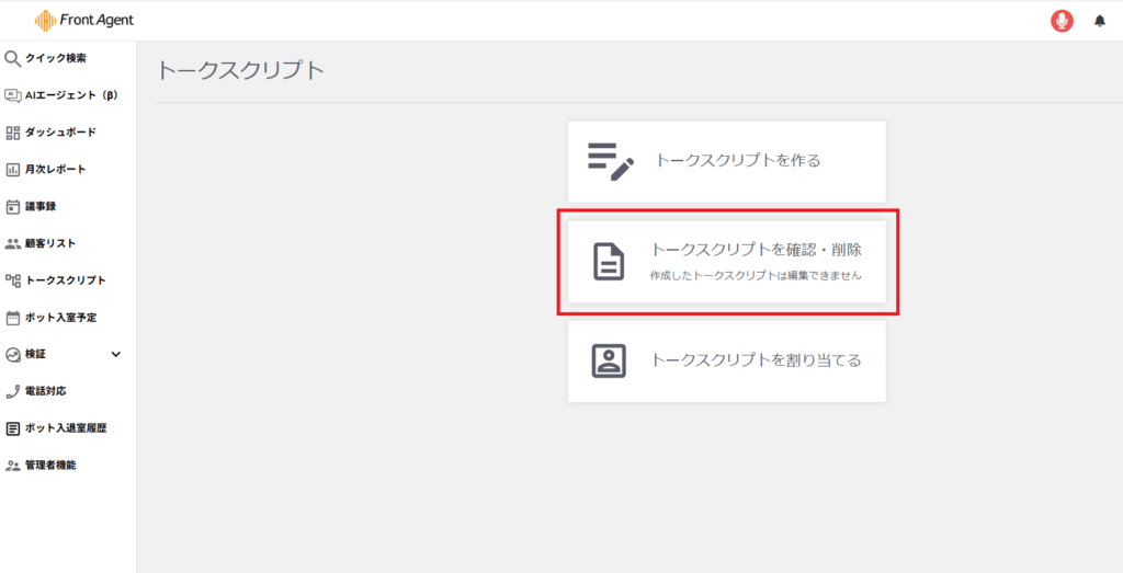 サイドメニュー トークスクリプト> 管理 > トークスクリプトを確認・削除をクリック