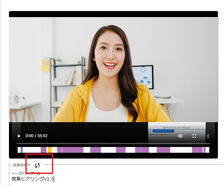議事録ページの動画下部の「トークスクリプト解析タブ」の再解析アイコンをクリック