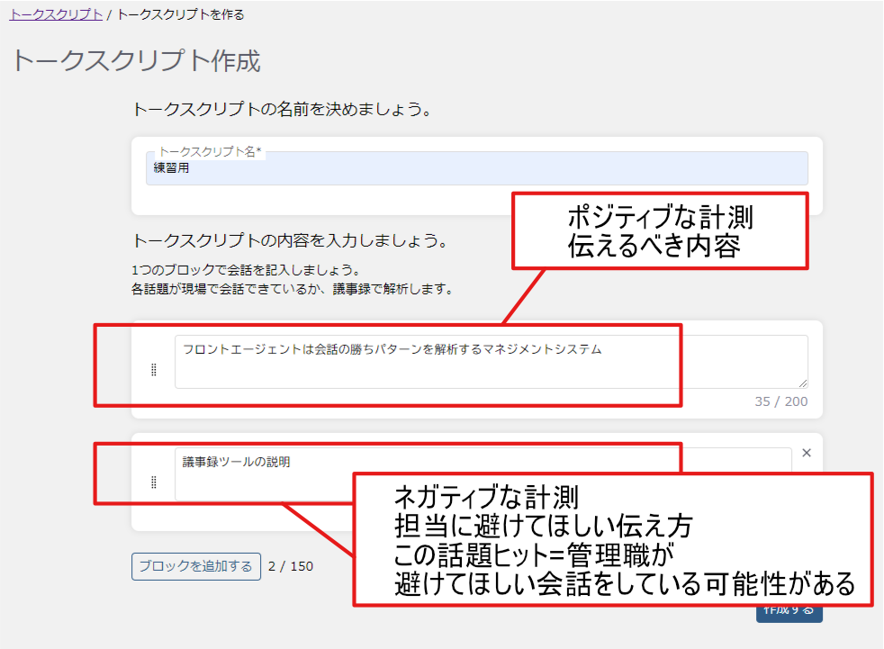トークスクリプト作成画面では、トークスクリプト名と内容を入力してください。
