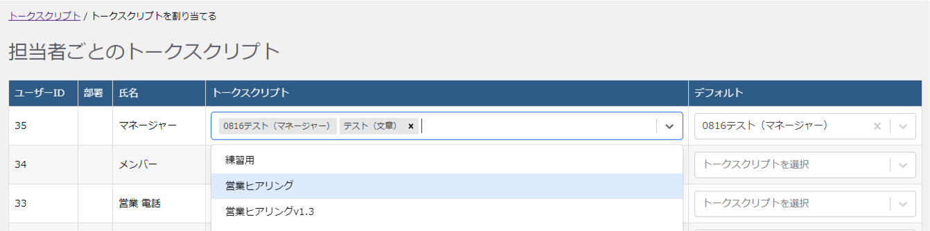 トークスクリプト作成後、トークスクリプトをユーザーアカウントごとに割り当てます。