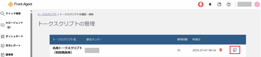 リストに表示されているトークスクリプトの複製アイコンをクリック