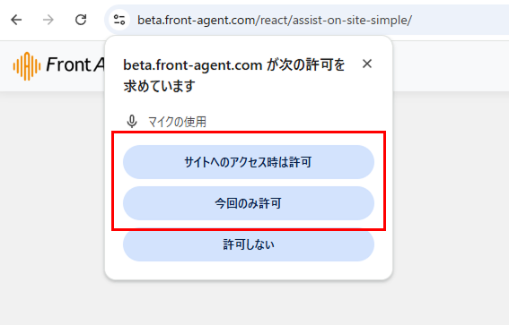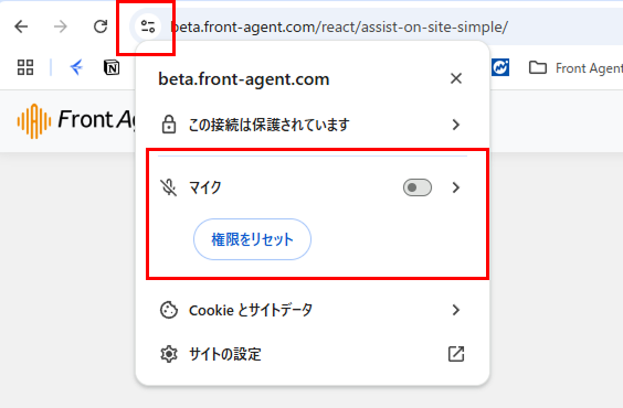 「許可しない」をクリックしてしまった場合、または許可設定の確認をする場合、アドレスバーの左横にあるアイコンをクリックし、マイクの使用権限を「許可」に変更後、ページを再読み込みして下さい。