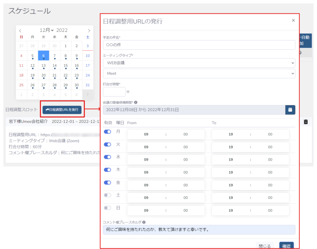 - 「日程調整URLを発行」をクリック