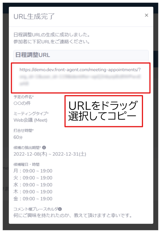 - 表示された日程調整URLをコピー