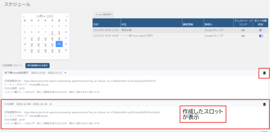 この表示スロットからでも日程調整URLの確認・コピーが可能です。また、不要になった日程調整スロットは