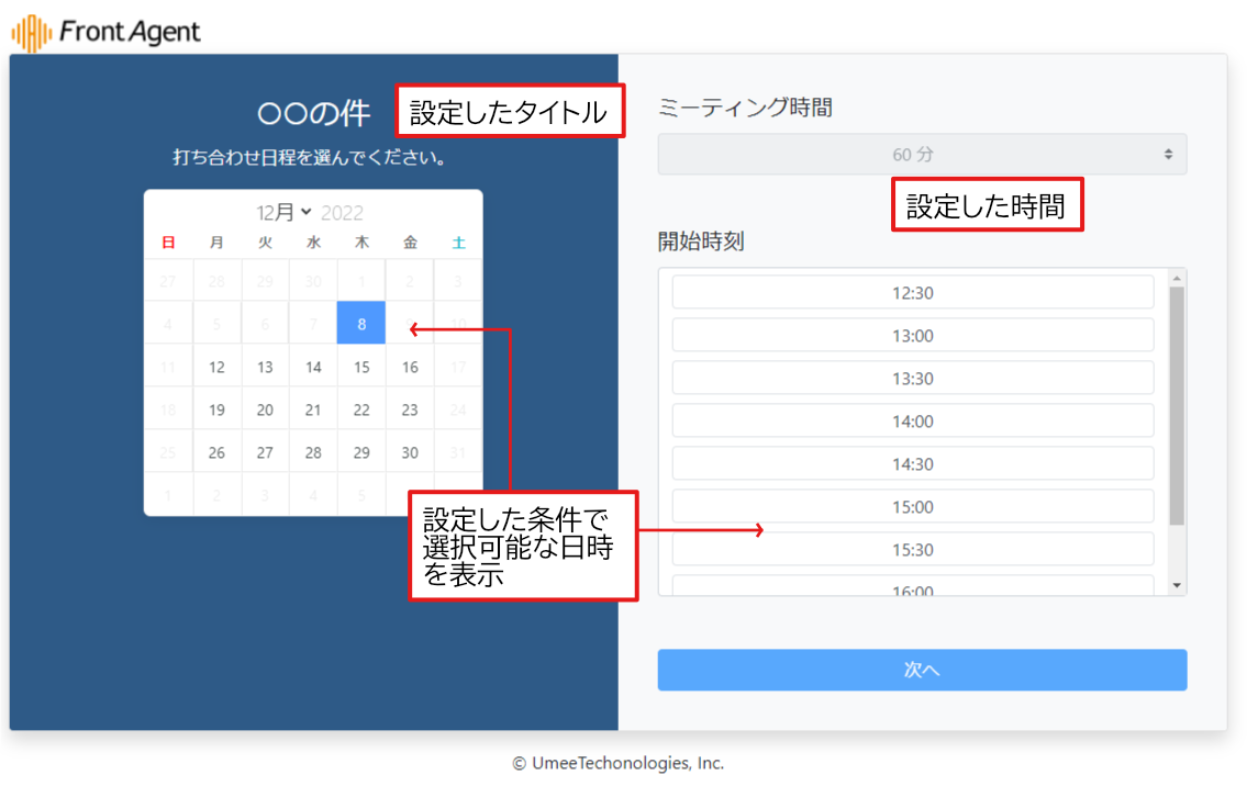 外部カレンダーとの連携完了以降、Front Agentユーザーは日程調整用のURLを発行し、会議出席者にそのURLを連絡するだけで、日程調整(Web会議の場合は会議URL自動発行&通知)が可能になります。流れは以下の通りです。