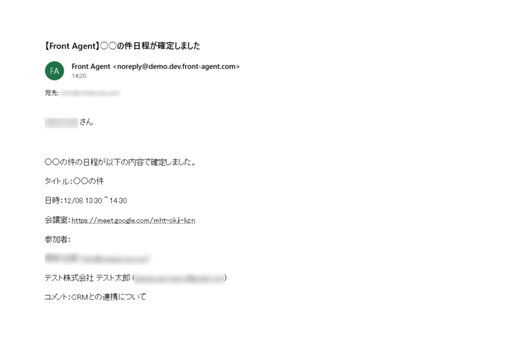 - Front Agentユーザーと会議出席者にリマインドメール(Web会議の場合は会議URL付き)が送信