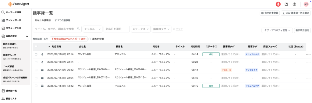 録音は議事録として顧客に紐づいて管理します。