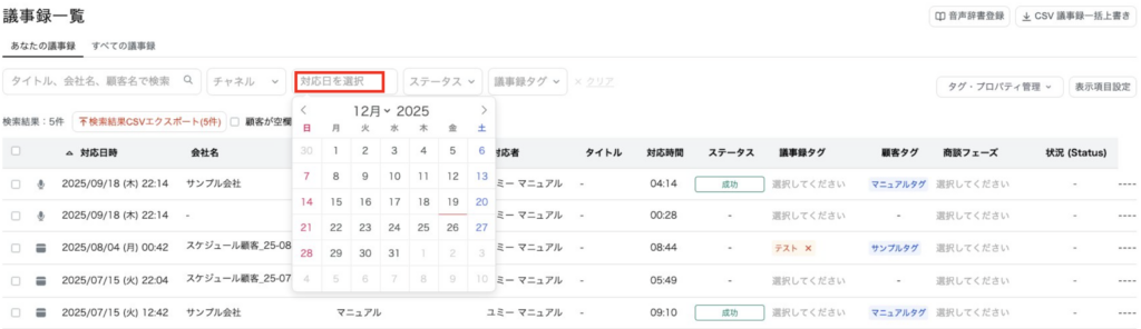 - 日付をクリックすると、該当日の議事録一覧が表示されます。
