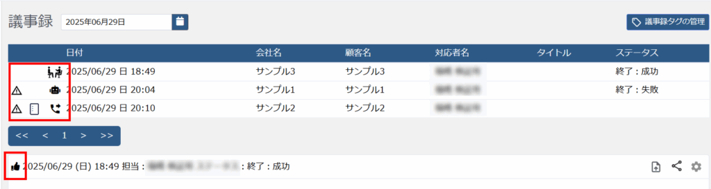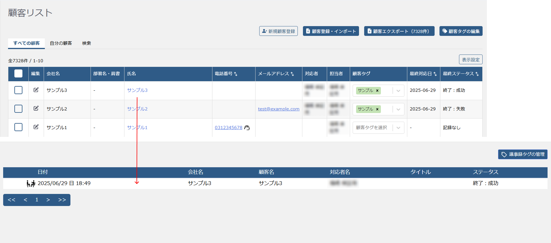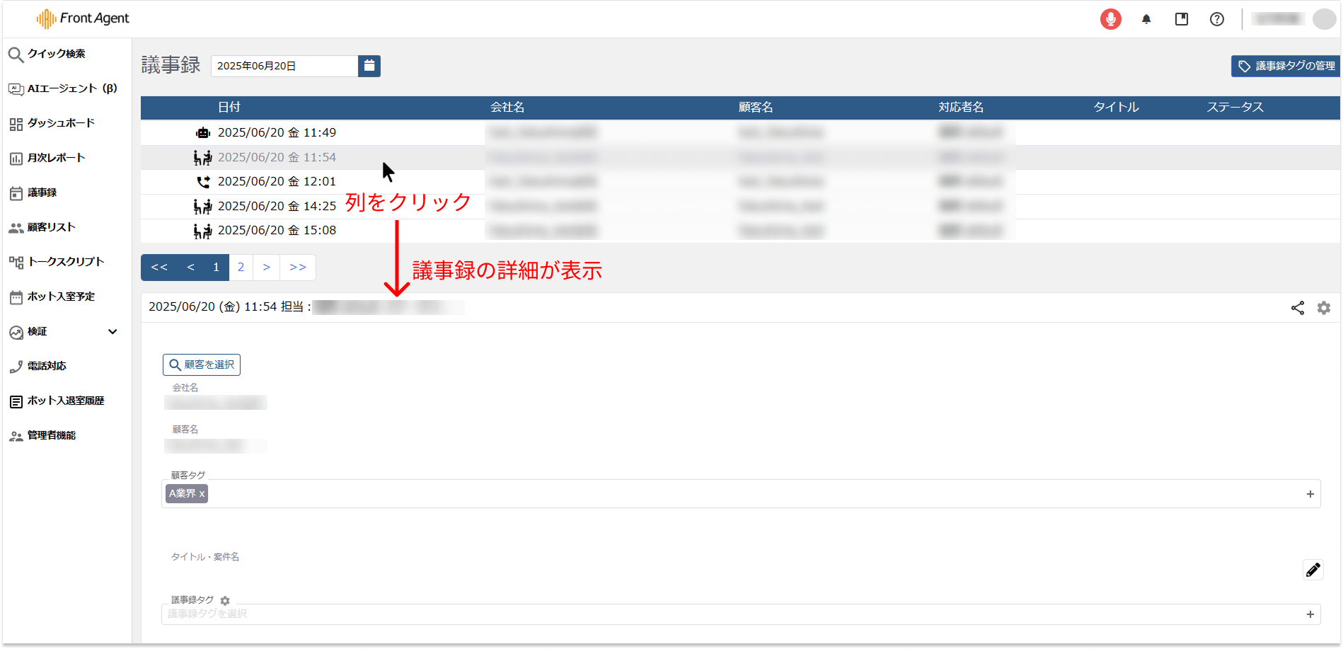 顧客リストの「氏名」をクリックすると、該当顧客の議事録が表示されます。
