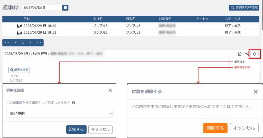 2. 表示されたメニューから「議事録を削除」または「事例設定」を選択します。