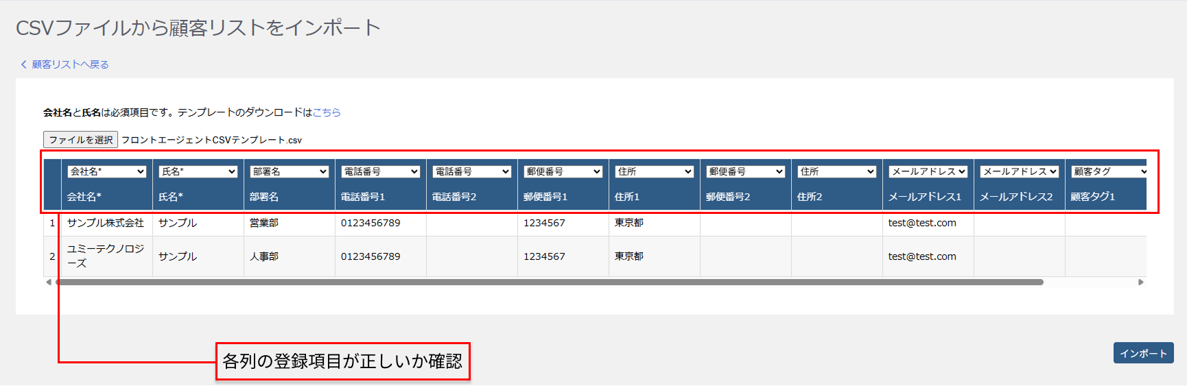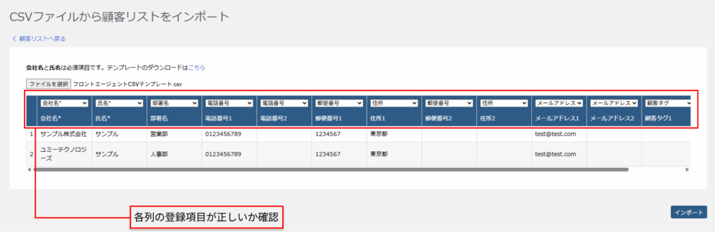 プレビューで各列の情報をFront Agentのどの項目に登録するか、正しい項目を選択して「インポート」をクリックしてください。