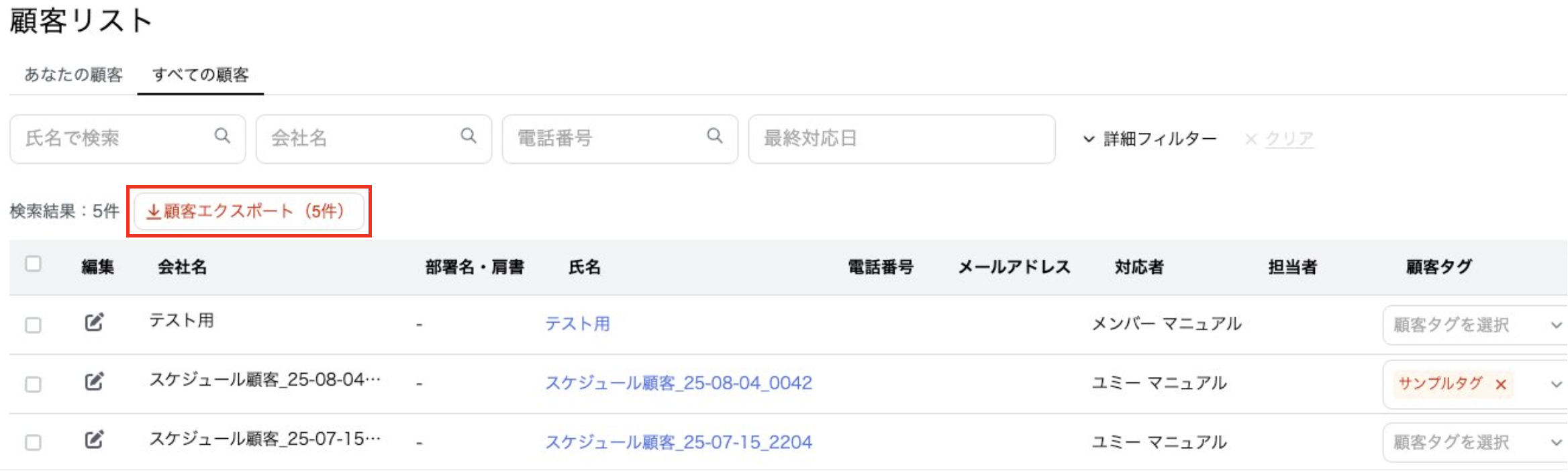 「顧客エクスポート」をクリックすると顧客情報を一括でダウンロードできます。