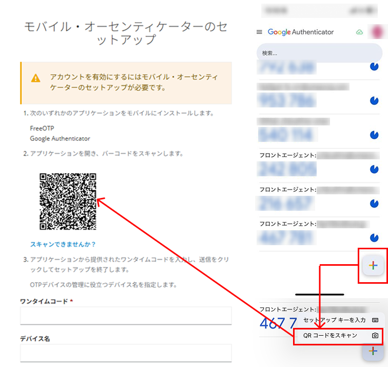 2. Front Agentログイン画面のQRコードをカメラで読み込み、端末にワンタイムコードが発行されるようにします。 ・デバイス名は空欄可。 ・QRコード読み込みは初回ログイン時のみ必要です。