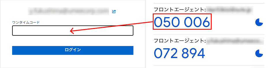 3. 認証アプリで「フロントエージェント:ログイン名」の連携データからワンタイムパスワードが発行されます。