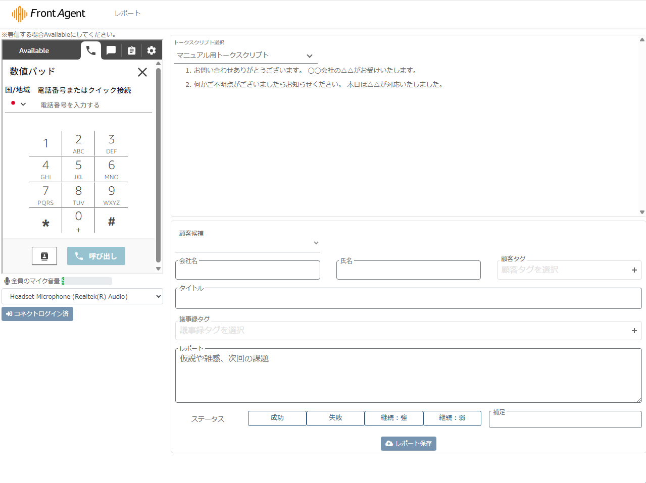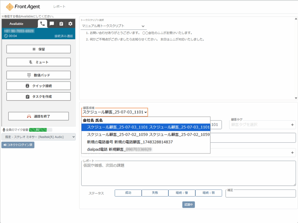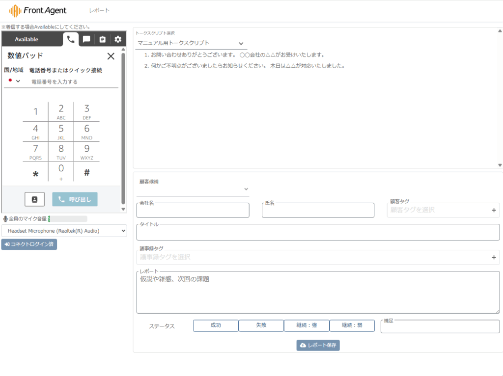 A. 現段階ではソフトフォンのみ分析レポートになります。携帯電話や固定電話など、Front Agentの画面上で電話をしないデスクフォンも議事録にしたい場合、別途お問い合わせください。