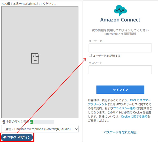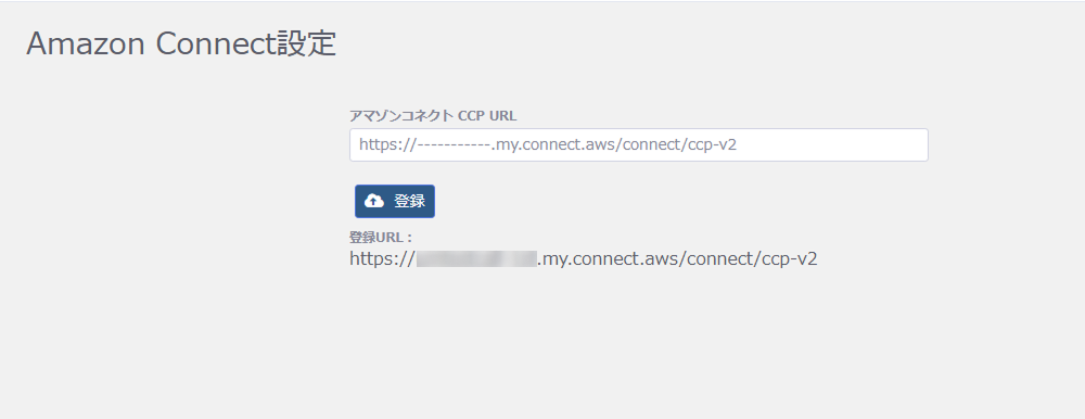 - アマゾンコネクトCCP URL欄に「登録するAmazon ConnectインスタンスのURL」+「/connect/ccp-v2」を入力する
