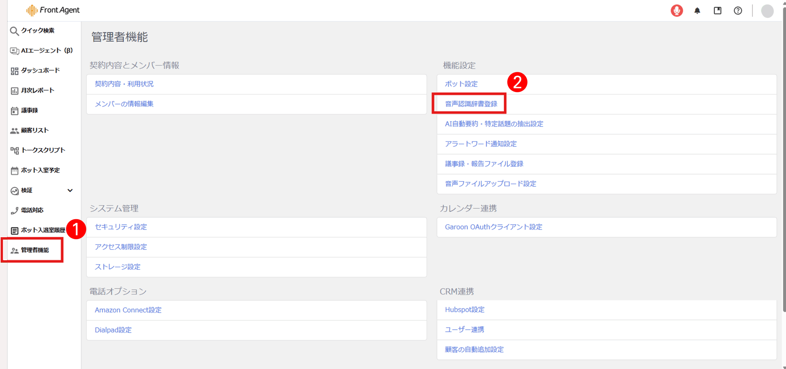 管理者機能 > 音声認識辞書登録にアクセスします。