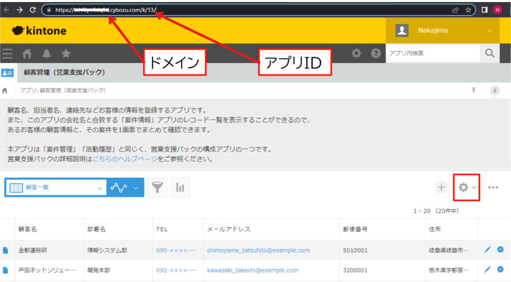 ③ アプリID: 顧客情報を保存しているアプリを開くと、URLは https://{ドメイン}.cybozu.com/k/14/ のようになります。この時の14がアプリIDです。