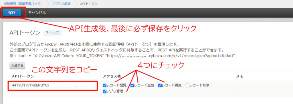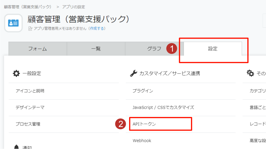 ④ APIトークン:顧客管理アプリと活動履歴アプリの2つのアプリで個別に設定が必要です。
