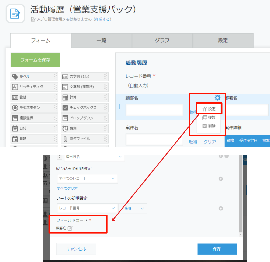 以下の画像はテンプレートの顧客管理アプリと活動履歴アプリの設定例です。