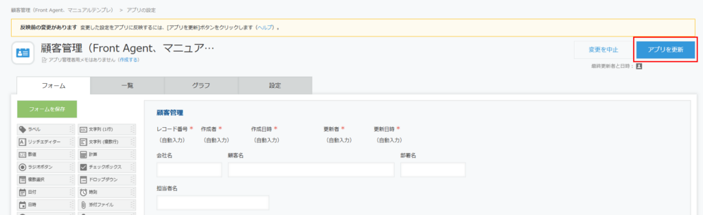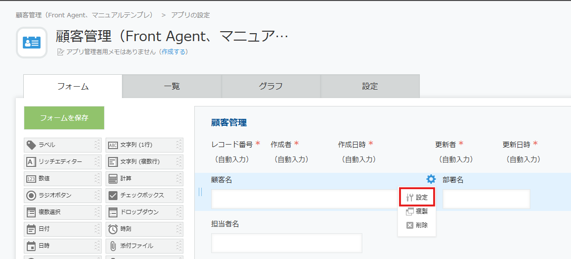 以下は「顧客管理(Front Agent)」のアプリを例に、各入力項目に関して解説します。活動を記録する「活動履歴(Front Agent)」アプリの設定も同様に行ってください。