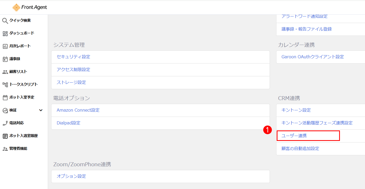kintoneとの連携設定が成功すると、管理者機能のページに「ユーザー連携」の項目が表示されます。