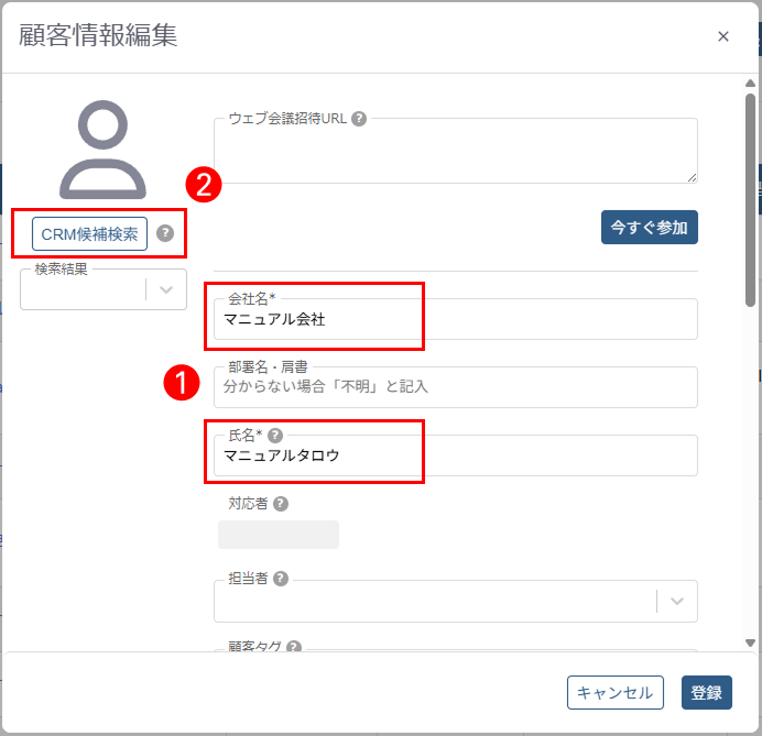 - 顧客リストの対象の顧客情報編集画面で、会社名・氏名を入力します。