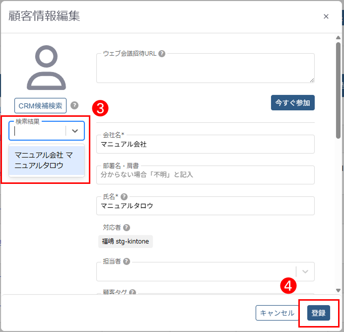 - kintoneの顧客データに一致した顧客がいた場合、[連携候補]のドロップダウンから候補を選択