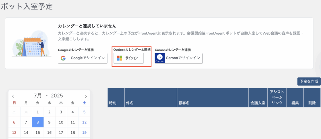 Outlookカレンダーに予定を登録後、Front Agentのボット入室予定ページで予定が反映されない場合、Front Agentのボット入室予定ページに再度アクセスをしてください。