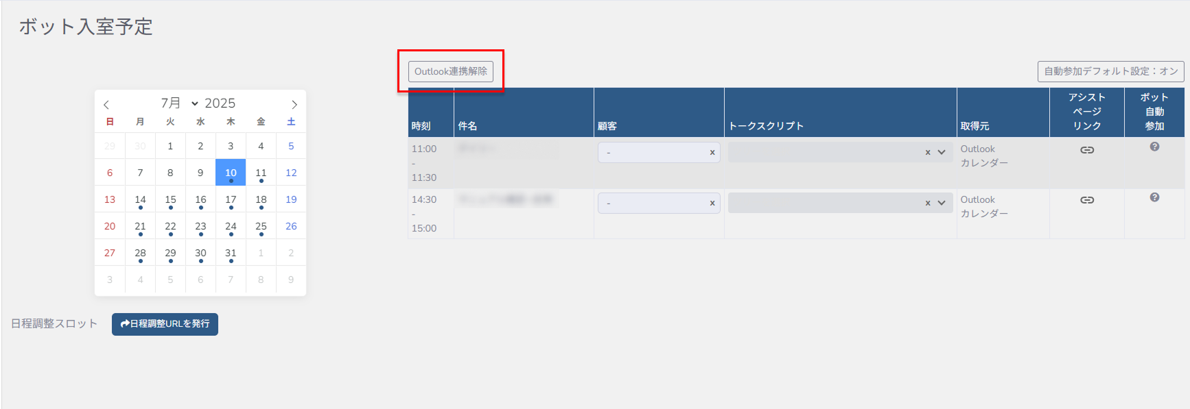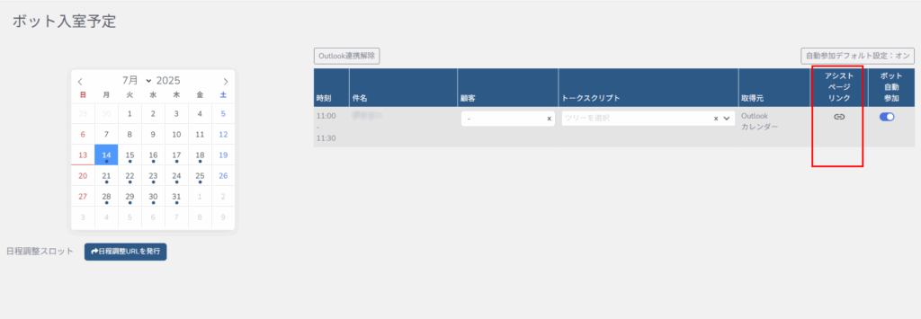 OutlookでWeb会議の設定がされたら、ボット入室予定ページの一覧に「ボット自動参加」という自動入室のON/OFFを設定するボタンが表示されます。