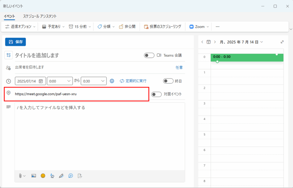 - 予定の「場所」欄にWeb会議URLを入れる(外部のWeb会議に参加する)