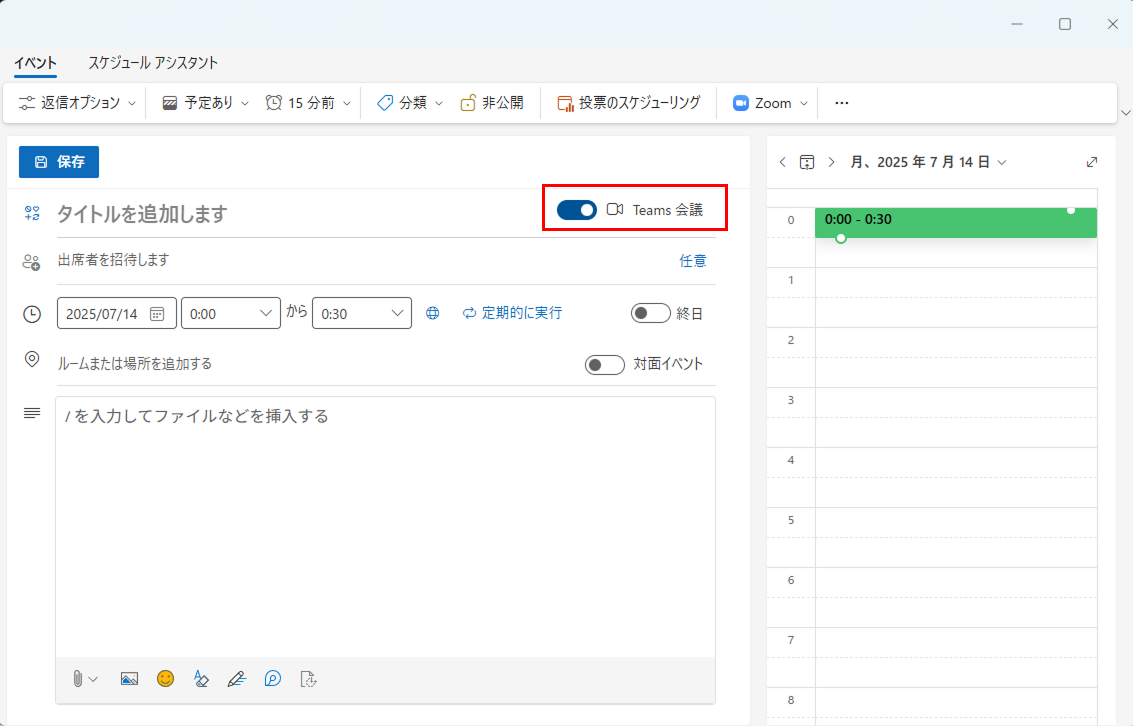 Outlookの場所欄にWEB会議URL(Zoom / Google Meet / Microsoft Teams)を貼り付けてください。