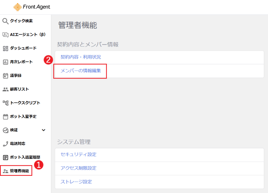 管理者機能 > メンバーの情報編集にアクセスします。