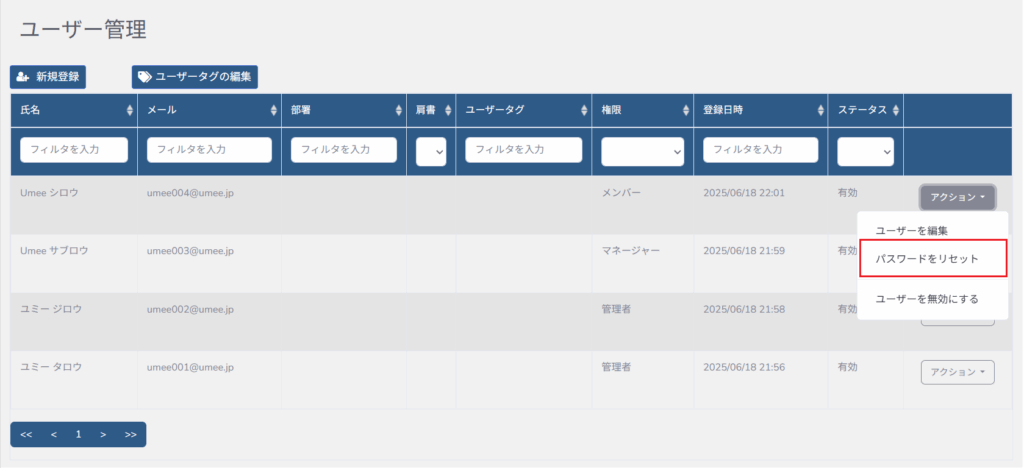 パスワードを再発行したいユーザーの「アクション」 > 「パスワードをリセット」をクリックすると、対象ユーザーのメールアドレスにパスワードの再発行メールが送信されます。