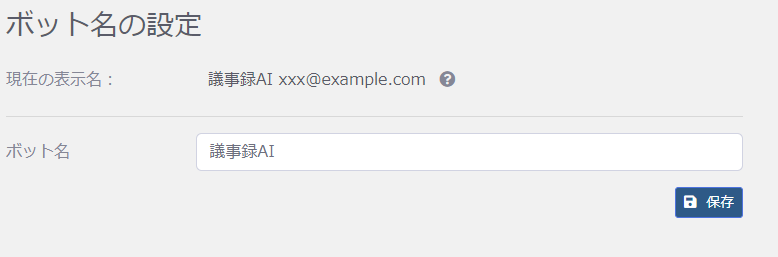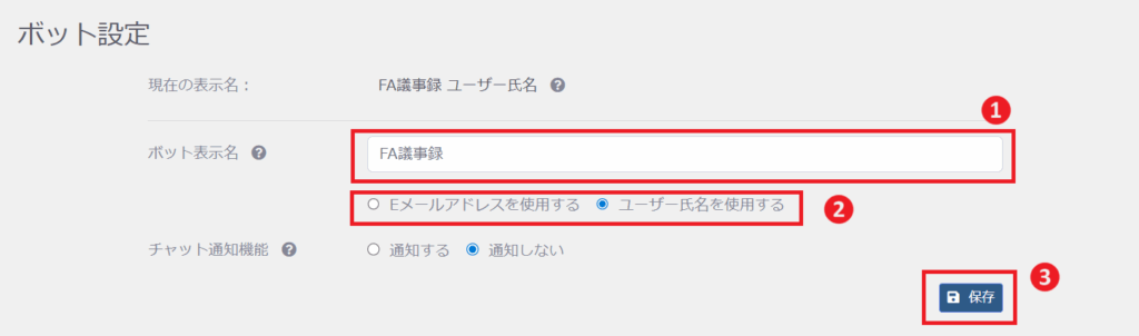 ボット表示名では、組織共通のボット名を記載します。「Eメールアドレスを使用する」、「ユーザー氏名を使用する」のいずれかを選択し、「保存」をクリックしてください。