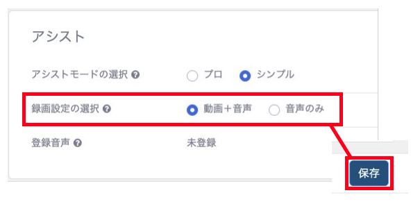 ユーザー情報編集画面を下にスクロールし、アシストブロックの③録画設定の選択から「動画+音声」「音声のみ」のいずれかを選択 > ④保存 をクリック。