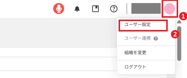 Front Agent画面右上部の①ユーザーアイコン > ②ユーザー設定 をクリック。