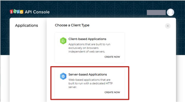 https://api-console.zoho.comへサインインし、「 ADD CLIENT」から「Server-based Applications」を選択