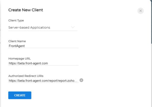 - Authorized Redirect URIs: https://beta.front-agent.com/report/report-zoho-authorization/