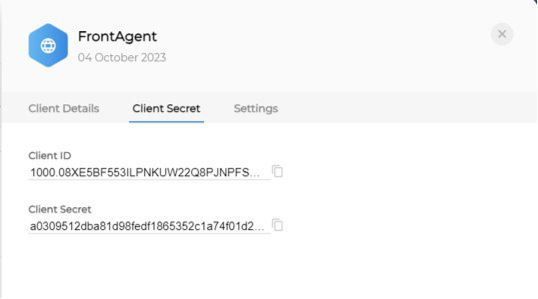 - Zohoのアプリ管理画面で「Client Secret」タブの「Client ID」と「Client Secret」をコピーしてください。Front Agentの設定で貼り付けます。