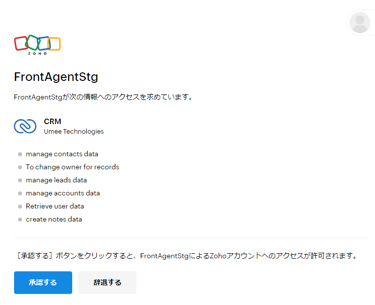 アプリのID情報が正しく設定できると、Zoho CRMの連携許可ウィンドウが表示され、「承認する」を押して連携を完了します。