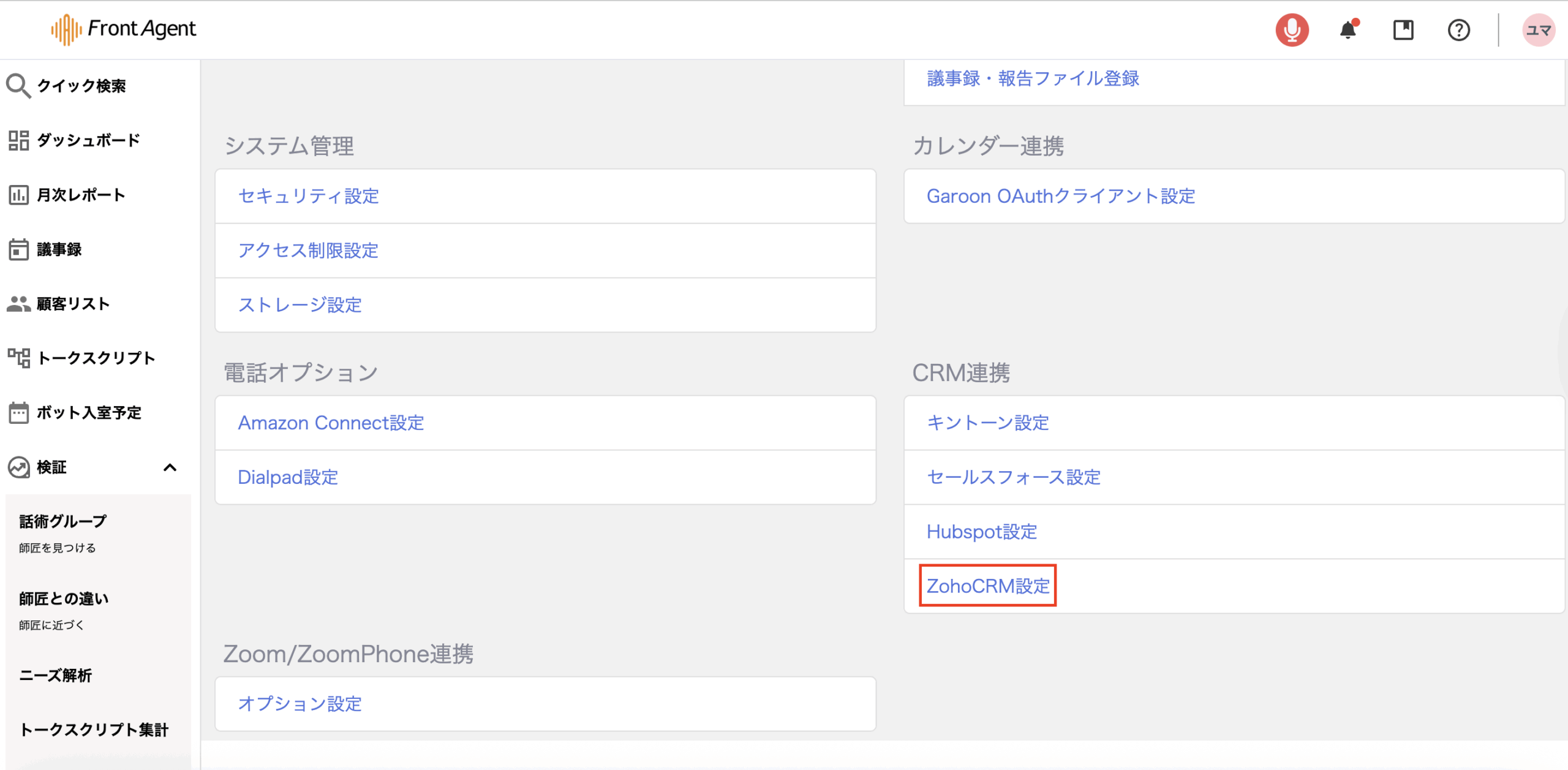 Zoho CRMとFront Agentのユーザーの紐づけ